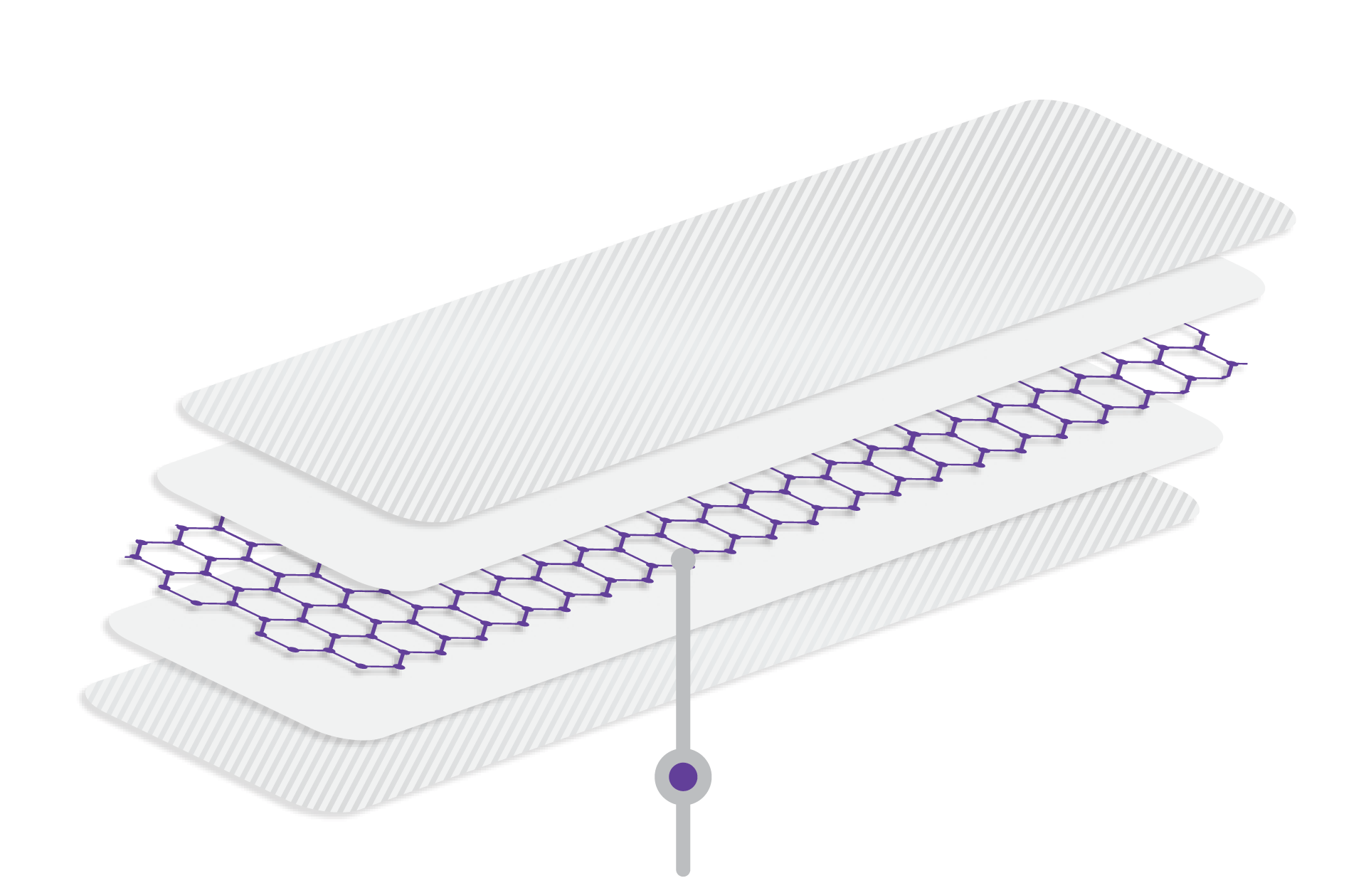 Layers of electrode fabric, separated by a specialized knit fabric, store the energy.